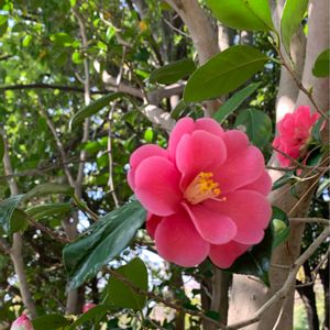 おはようございます😃 今日は美人椿二つです。 八重咲きから蓮華咲きに近い、紅色の花です。 とても姿が整った美しい椿です。 筒シベは細いですが、崩れてはいません。 色々調べました。 自信がありませんが、 紅都鳥という椿と予想します。 本当は神代都鳥と言いたいのですが、 それは神代植物公園でしか見られないそうです。 しかし、色合いはとてもよく似ています。🧐 かなりの大木で、花数も多いです。😊