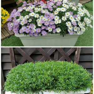 3月末に作った寄せ植えの現在です。😃 ネメシアと、オーブリエチアは消えそうになってるけど、 他のオステオスペルマムとブラキカム、ヘリクリサム ライムが元気でいい感じです。🎶 肥料はあげるけど、細かすぎて終わった花をろくに✂️してないブラキカムなのに 次々お花咲いてくれるありがたい子なんですね。ʕ •́؈•̀ ₎ いつまで頑張ってくれるかなー