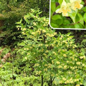 ウゴツクバネウツギ(羽後衝羽根空木) 羽後←秋田県羽後町の事が良くわからない 枝先にラッパ状の黄色い花を普通ふたつける。花後も残る5枚の萼片が特徴的。