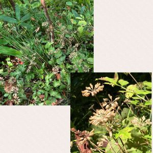 タチシオデと教えて頂きました 細い枝から巻きヒゲ 葉も薄く 線香花火の様な花が気になり写真 始めはシオデかと思いましたが葉が違う