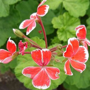 8月11日 今日のお花『ゼラニウム』です。 【ゼラニウム】 南アフリカ原産、フウロソウ科多年草 四季咲き性で、温度が適していれば一年中開花する。 花は一重咲きから八重咲きまであり、星形やカップ状の小花がボール状に多数集まって、長い花茎の先端につく。 草丈:20~100cm、開花期:3月~12月上旬 花色:白,赤,ピンク,オレンジ,紫,複色 picはミスターレンという品種。 白い花びらに朱赤のクレヨンで色をのせたような柄、くっきりとしたコントラストが目を引く。 ガーデンマルシェ防府