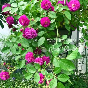 ◎ミニ薔薇・スイートチャリオット フレームに収まりきれなかったのですが 写真てっぺんから真ん中に太い5〜6本がニョキっと立っておりそれは70cmぐらいあります 他は垂れ下がるようにワサワサ咲いてるのですが一部の太い枝は上に上に伸びてます