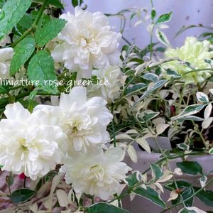 久しぶりのミニバラ・グリーンアイス 今は真っ白ばっかりです💧 右隣の斑入りのリーフは 小さな苗から育ててる羽衣ジャスミンのミルキーウェイですが 春から育ててますがさっぱり蕾もつかず 今年はお花咲かないのかな?😢 葉っぱが気に入ってお迎えしたので 今ワサワサしててこれはこれで 気に入ってますがお花も見たいなぁ😭