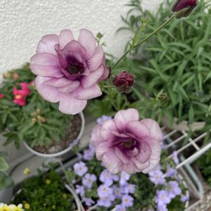 2023年春からのミネルバと今年仲間入りのティーバ。ミネルバは冬の間に4つに株分けしました。ティーバが色合いが変わっていくのがきれいです。ドライにすると赤が抜けて青っぽい紫になりました。 2枚目3枚目は購入した花苗。