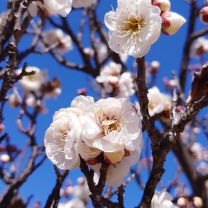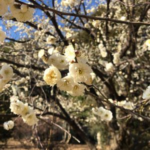 3月10日、 水戸偕楽園の青空のもと、 八重咲きの白い梅の花🌸