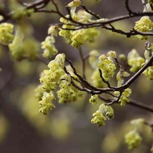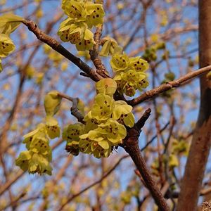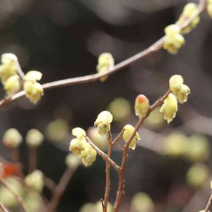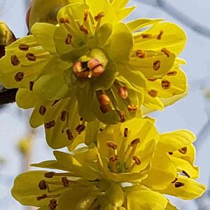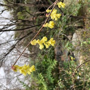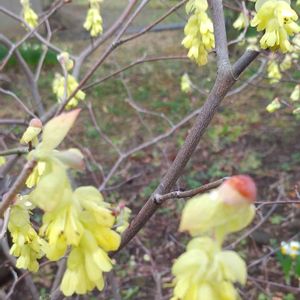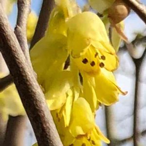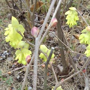 【土佐水木】《マンサク科》 日向水木と比べて、 一房の花の数が多くて花も大きい。 おしべの部分は茶色。 (開花直後はおしべは赤っぽい。 花が開いてくると 次第に茶色くなるようだ) 2021.3.7