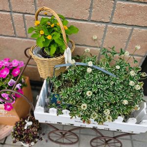 おはようございます😊 玄関のお花が満開です💕 八重咲きカリブラコア・レモンイエローとサフィニアアート小梅ちゃん♡ そろそろ切り戻ししなくちゃね😊