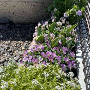 朝の太陽ある時間に😊 カンパニュラ ラヴィオラ PWスーパーアリッサム チューリップは葉が斑入りの黄色が咲く予定です 思ったよりみんなもりもりで窮屈そうです😓間隔間違えたかな