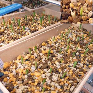 ガガイモの種蒔き風景 しんどいわ…🫠 種から綿を取る作業w 鞘が開く前に処理すると 多少は楽! この鉢を合計で10個程作る予定です! 1つの鉢に約30個程発芽 そして右上の発芽したものは何故か物凄い白色…まさか斑入り!? この白は約3/60の割合で出てきました!同じ鞘からでも花の色合いが違うのかどうか実験するのも良いかもですね❕