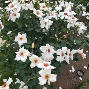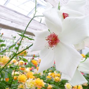 一重のバラ🌹 ホワイトウィングス White Wings 細めの枝に白の一重の花が房咲きになり、微香があります。花付きが良く多花性で、 繰り返し良く咲きます。樹性も強く、丈夫で中背に育ちます。 作出国 アメリカ 四季咲き/大輪(10cm前後)/中香/直立性