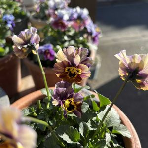 庭人さんビオラたちです✨ ①幻夢 ちょっと徒長気味ですがふわっと満開です✨ 花弁の上が日焼けでチリチリになるので日陰エリアに移動させたら徒長しちゃった😅 幻想的な色合いでうっとりと眺めてしまいます💕 ②?? 名前はわかりませんが、2つのお花が咲きます✨ 最近は黄色っぽくなってますが、色んな色が混ざりあったような不思議な色合いのお花です。 低い位置には黒っぽいビオラが咲いてます。 この高低差、狙って作ってるのかな? すごいなぁ😊 ③こちらも名前はわこらないけどブルーの小輪ビオラがふんわりと広がって咲いてます💕 上から見るときれいなまん丸です😆 ④ブルーシャドウ こちらも複雑に色が混ざりあった幻想的なビオラ かっこいい✨✨ ⑤名前不明です。 小輪のちょっとフリルのあるお花が咲いてます。 まとまってたくさん咲かせられなかったのが残念💦 初めて育てた庭人さんビオラ✨ かっこいい、おしゃれ、かわいい、色んなバリエーションのある素晴らしいビオラです😍 育てることが出来てよかった💕 また来年も出会えたら嬉しいなぁ😊