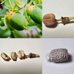ホイミさ〜ん(」゚Д゚)」オ────イ!! やっとミルシニテスの果実の解剖が出来ましたよ〜ε-(´∀`; )フゥ ↖️未熟果実↗️熟した果実。ポロリと外れます。↙️3つの部屋があって各々1個の種子が格納されています↘️種子。面白いデザイン😃 取り出した種子はもちろん蒔きました。芽が出るでしょうか?
