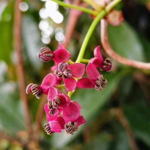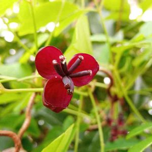 先程のつる草の花と一緒のつるにこの花も咲いてました こちらはさっきの花よりずっと大きなお花です これらって、 アケビの雌花、雄花? 公園の金木犀に絡んでおりました
