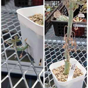 昨日 ハウスで地面に刺さった 鉄の棒を背に向け、 見ないふりしながら、 出来上がった棚に 多肉さんを引越ししつつ、 メルカリに出せるものを整理。 そしたら、 七宝樹が2ポット出てきて、 1つは瀕死状態 もう1つは、 にょきにょき伸びてて でも、枯れてる感じもするし、 瀕死状態のと一緒に 様子見しようかな?と ポットを持ち上げたら、 なんか横から出てる~!! どーしたらいいのでしょう? この状態!!