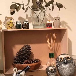 陶器とフクロウ お祭りピックだぁ~٩(ˊᗜˋ*)و✲゚.* 一番左の変な固まり… 娘がお気に入りの変な奴… でも、しばらく見てると可愛く思えてくる…… 真ん中のまん丸一輪挿しはまるさん手作りの可愛い備前焼(⑅˘͈ ᵕ ˘͈ )✲゚.*