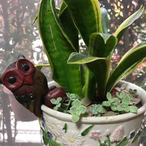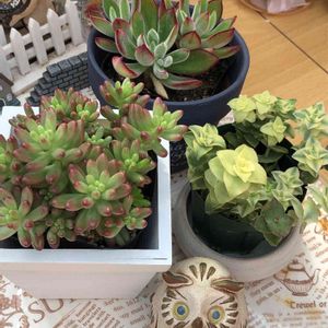 道の駅で狩った多肉さん フクロウは家族旅行の土産です。 娘が作った鉢😅もう少し大きく作ってほしかった