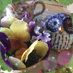 こんにちは☺ グリーンと陶器とフクロウと✨ 参加させて下さ〜い❣ ✂したビオラちゃんの🌸達 まだまだ可愛いので集めて水に浮かべてみました😃♬❣ 何焼きか忘れたけど、☕カップが出演.┏(ꒉ:)و ̑̑