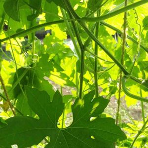 お散歩途中、ゴーヤの葉の下でひと休み。 それにしてもこの匂い、マスク越しなのにクセが強い!😅