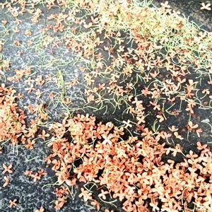 雨が上がって外に出たらもう甘い香りはしませんでした。 お散歩中、地面のあちこちがオレンジ色に・・・ 冷たい雨はキンモクセイのお花を散らせて 香りは全て連れて行ってしまったみたいです。