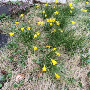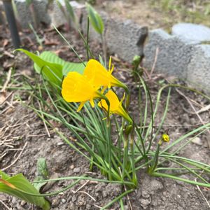 ウメの木の下の 黄色いお花は何? 近づいてみると ペチコート水仙でした😊 小型原種スイセンの一つ