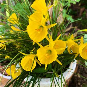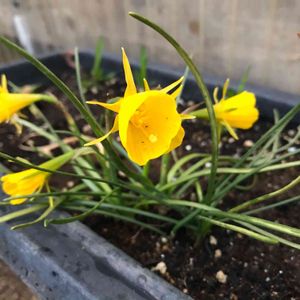 ナルキッスス・バルボコディウム Narcissus bulbocodium 別名 ペチコートスイセン 原種のスイセン💛💛💛 鉢植えにしています😊 咲いてきたので写真撮って📸 道路側花壇に移動😊