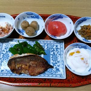 昼餉の支度が整いました🍴 鯵のムニエル 焼ピーマン 冷奴 里芋煮物 トマト きんぴら(牛蒡と人参) お帰りマンゴー(ドライマンゴーを一晩ヨーグルトに浸す) カロリー計算は出来ないけど 彩りを気をつけてます いつまで調理出来るか分からねど 楽しくおままごと気分で作ってます(笑)