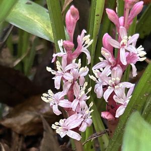 キチジョウソウ(吉祥草) スズラン亜科キジカクシ科 花期:10〜11月 分布:関東以西の本州〜九州 ・暖地の林などに生える多年草 ・花茎の高さ10㌢ほど ・葉間から10cm前後の花茎が伸 び、淡紅紫色や赤紫色の花を付け る ・花は両性花と雄花があり、基部は 筒状で先が6裂 ・葉は長さ10〜30㌢の広線形で、 花茎より高くなる ・果実は赤く熟す 両性花は花序の下部に多いようです 分かりづらいですが、①の右側下方に雌蕊を持つ両性花が見えています②の下方にも雌蕊を持つ両性花が見えます ③は蕾と昨年咲いた花の果実が同じ株に見られました。 雄花は花序の上部に咲き、6本の雄蕊のみで雌蕊の花柱は退化、あるいは小さく未発達なんだそうです。 地元のお山へのアプローチ、日陰で 湿り気のある所に沢山咲いていました。