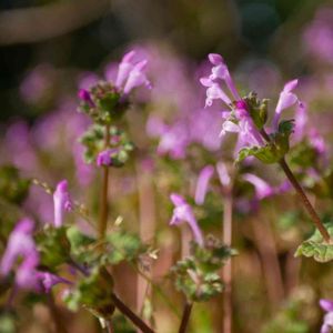 葉っぱの台座から出てくるピンクの花🌸 ヒメオドリコソウ(姫踊り子草) シソ科 花期:3〜5月 1つの花は筒のような形で、赤い葉っぱの間からニョキッと出ます🌸 葉っぱは柔らかな毛でフワフワ 茎の上部の葉は赤紫色を帯びる。
