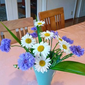 食卓の花 🌿💙💮🌿💙💮🌿💙💮🌿💙💮🌿 食堂のテーブルにお花生けました。咲きだしたフランス菊とヤグルマギクです😃🌸🌿