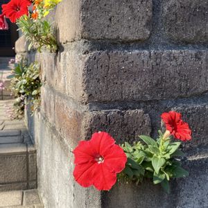 ご近所さんの玄関アプローチ レンガの隙間に根を下ろし、力強く咲いていました。