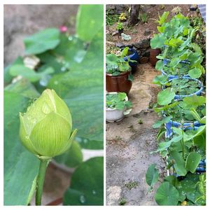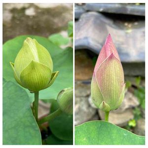 今現在の雀の庭の茶碗蓮☔️ 昼まで雨降りだとか。 開花は明日以降です、雨に当たらなくて良かった〜😊 左の画像は白花蓮💕 蕾の先端が白くみえますね。 開花寸前です、明日から目が離せません🤣🐥 現在、蕾は39本も上がっています😱