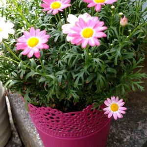 PW マーガレット バブルガムフラスト🌸 もうすぐ終わるマーガレット✨ 花色に、合わせて選んだ鉢色が、とっ〰️ても、花とバッチリ👌でした。 一つ欠点が、上のメッシュ部分から、水やりの時の水がこぼれるのが🆖 模様のメッシュだったら、💯の鉢なのにな⤴️😉 次は、秋🍁にまた綺麗に咲いてくれますように🙏