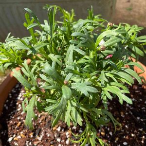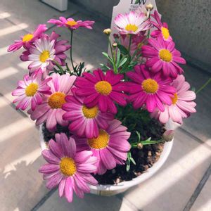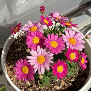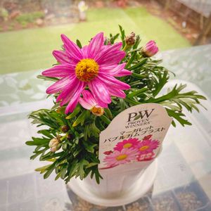 PWさんのマーガレット バブルガムブラスト。 咲いていたお花が寒さでダメになり、暖かい日の日中だけ外へ出し、寒い日や時間はガレージに入れるようにしたら、つぼみが開いてきた❤️ なんとかこの冬を乗り越えてね。 葉っぱもつぼみも増えてるし、春が楽しみ🎵