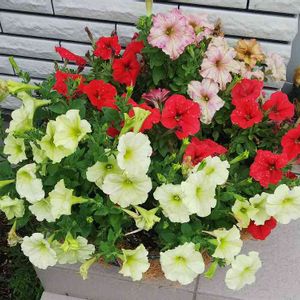 こんにちは 八ヶ岳ファーマーズマーケットからやってきたペチュニア5種類です。 植え替えしてからやっと落ち着いてきたので、週末から玄関前に、置きます。