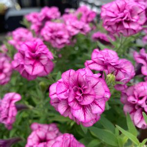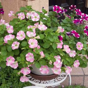 似てるシリーズ① 左はサントリー、サフィニアアート あずきフラッペ 右はハルディン、ペチュニア 紅色小町 両方とも白の部分が気温などで増減するらしい。 写真の色や柄はすごい好き💕どんな姿(変化)を見せてくれるか楽しみ。