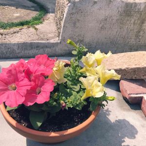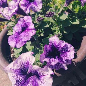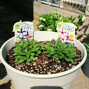 ペチュニア🍀さらさ 今日鉢植えにしました。 今朝同時に3輪の花が咲きました。 咲き始めはピンク色が強くて、花衣紅水晶に似てる気がします😁💦花の大きさは3cm位です。 もう一つ寄せ植えしたエトワールとクリームソーダは、花が咲き揃った頃にUPします😅💦