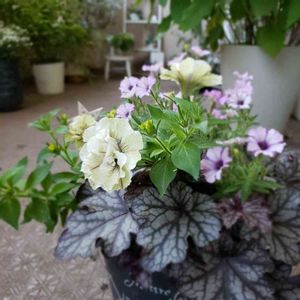 寄せ植えしてた鉢がようやくお花をたくさん咲かせてくれ始めたので撮影会♪ 今年は大人カラーのペチュニアとヒューケラを❤︎