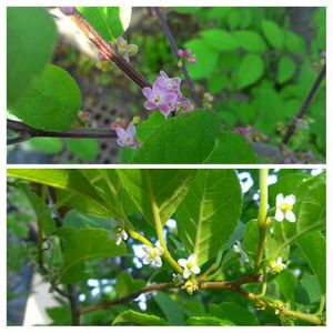上も下もウメモドキ(梅擬き)でしょうか? 白い花の木の足下に赤い花を付けていました? ん! 花びらの数が違う😨 もしかしたら 上が雌花 下が雄花かな?