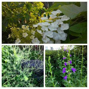 上 カシワバアジサイ柏葉紫陽花 大分咲き揃ってきました。 右下 ハタザオキキョウ旗竿桔梗 合っていますか? 左下 何でしょう?青虫さんが好んで食べます。 母は以前アスパラの葉と言っていましたが…? PS 右下 ハタザオキキョウに決定 右下 アスパラガスと教えて頂きました。