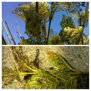 😱(@_@)😱(@_@)😱 なんの木か皆様にお尋ねしようと写真を撮りに行ったら、 やられてました😭 PS 庭師さんに消毒していただきました。 新芽もあるそうで、なんとか生きているそうです👍