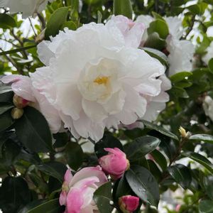 庭の真ん中で華やかに咲き誇る白椿 毎年名前がわからないと騒いでいます。 11月から咲いている白椿(11/16,12/1投稿)は加茂本阿弥と思いますが あちらとの違いは蕾です。 向こうはまん丸く こちらは尖っています。 あちらは花が下を向いて咲く場合が多いですが、 こちらは葉の上に花芽が付くので花が目立ちます。