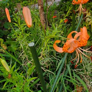 鬼百合が咲き始めました。 同じ色の檜扇水仙が下の方で咲いています🧡 分かりにくいですが ムカゴがいっぱいついています。