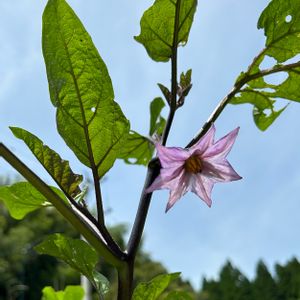『涼』を求めて来てみたら 葉っぱは虫に食べられて 穴だらけだったけど🌿 畑にナスの花が一輪だけ咲いていた♪ さすがに実家も暑いなぁ。。。