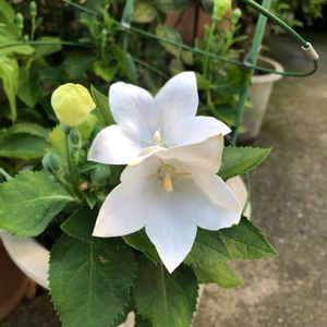 桔梗がまた咲きました❣️😊 ひと通り咲き終えたので、半分位の丈に切り戻したのですが、ぷっくりが現れての二番咲き❣️ ご近所さんからポット苗をいただいての2年生、 夏の白いお花ははいいですね〜。ほんのり紫がかっているのも気品があります。