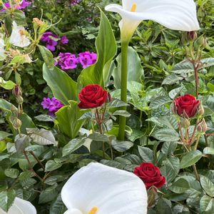 百花繚乱❣️強風で植木鉢を大慌てで寄せたら、いい感じに(笑)😊 カラー、ゼラニウム、ミニ薔薇の共演ですね〜。まるで地植えの庭みたいになりました😊