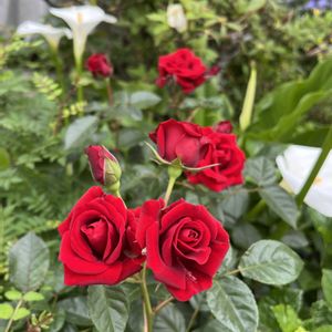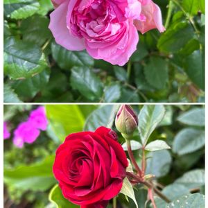 ローズポンパドールと赤のミニ薔薇🌹が咲きました〜。私の誕生日プレゼントとしてやってきて共に4年生となりました❣️ ローズポンパドールの方は、大輪のお花で香りもいいのですが、枝が細くてお花が垂れ下がっちゃう💦 ミニ薔薇の方は、これぞ王道の薔薇という花姿でミニ薔薇にしておくのがもったいない位花が大きくて😅葉も黒味がかっててカッコいい❣️
