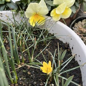 4年目の植えっぱなしクロッカスが一輪だけ咲きました❣️「おっ咲いたな」と、隣に置いた植木鉢から、よく咲くすみれが覗いてるみたいでかわいい😍 クロッカスは今年あたり植替えした方がいいのかな〜?できればこのままにしたい(笑)