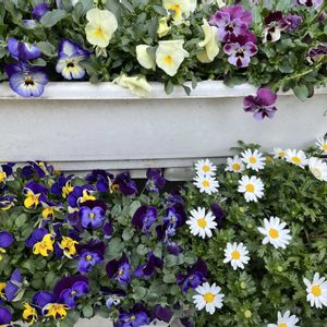 ノーブランドのパンジービオラの3色植えのはずが、2色にしか見えない😅そして、どの子がパンジーでどの子がビオラかすらも不明😅それ位当初からモリモリ咲いてくれています❣️やはり、花付きや苗ポットの後ろを見て根回り確認したり(抜けないからね💦)、株元のしっかりさの3点チェックは重要ですね〜。