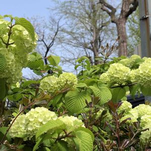 🟢🟢大手毬 オオデマリ よそ様の植栽 薄い緑色が爽やかで美しいです♡♡ だんだん白く‥真っ白になります✨✨ これも大好き😘 手前の葉は、姥目樫の新葉ですが艶やかで柔らかそう♡♡