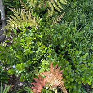 今朝の庭☀️ ジャノヒゲの実がキラリ🤩 ベニシダは他のシダが枯れてもそのまま🌱 おばけ状態ユーフォルビア👻 ピラカンサと、後ろに宿根イベリス。 咲かなくなって4.5ねんたつ。施肥やリフレッシュしても古すぎる株はだめなんだな😢
